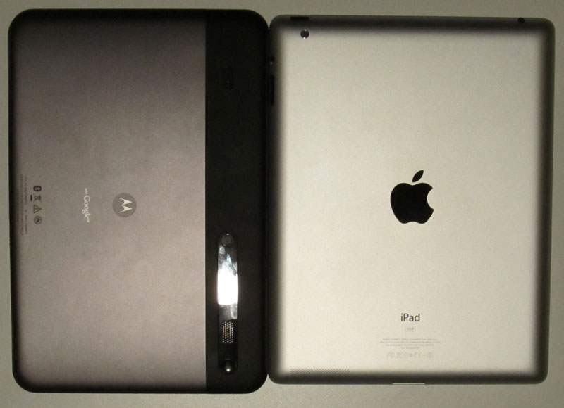 The Motorola Xoom and Apple iPad have very different screens. The iPad's screen measures 9.7" diagonally with a resolution of 1024 x 768, a 4:3 ratio. The Xoom has a 10.1" screen with a resolution of 1280 x 800, a 16:10 ratio. What it comes down to is the iPad's screen is about 3/8" wider than the Xoom's, and the Xoom's display is about 3/4" taller.